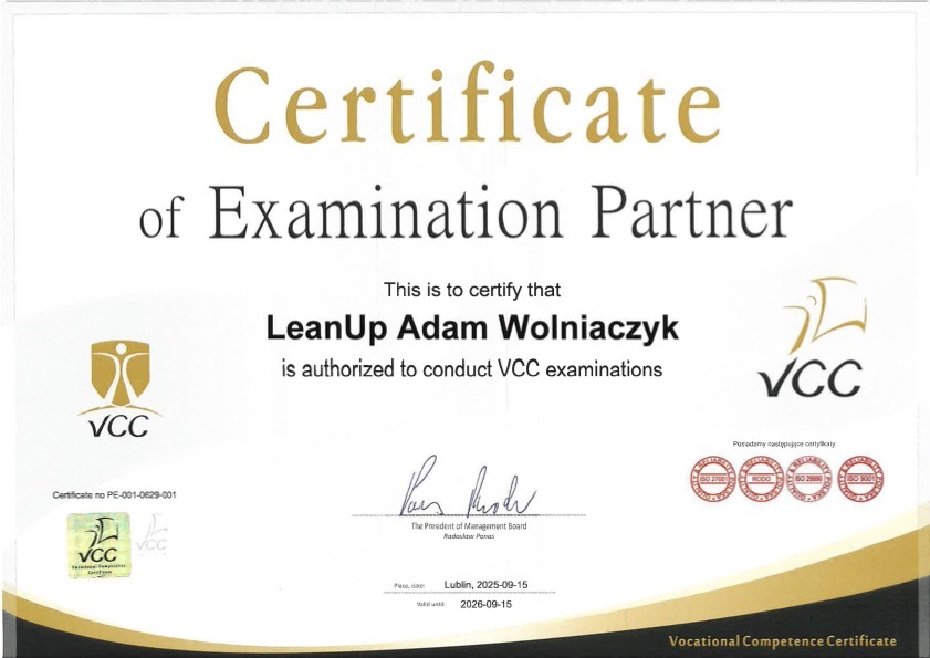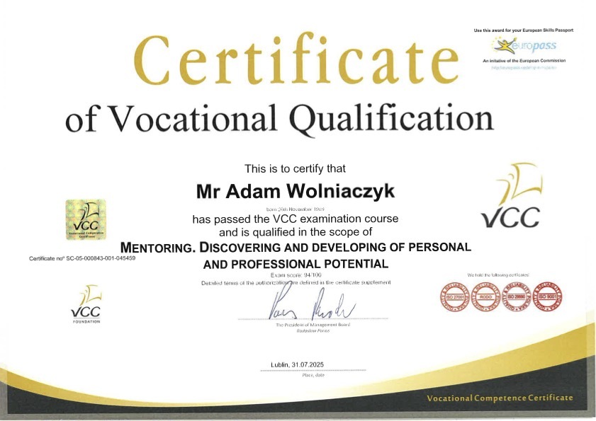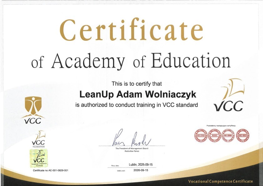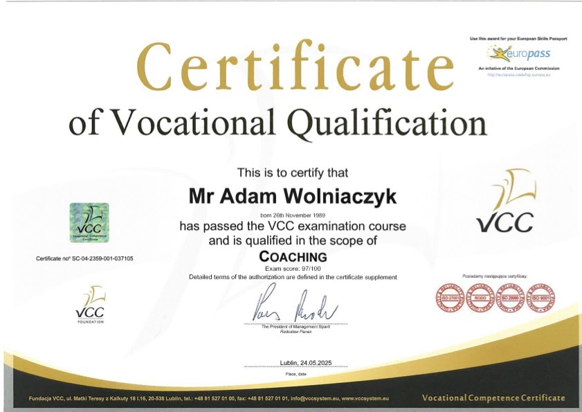 Stale rozwijamy nasze kompetencję żeby lepiej świadczyć swoje usługi. W trakcie ostatnich lat każdy trener zdobył indywidualne umiejętności oraz certyfikaty, a w 2025 roku uzyskaliśmy akredytację VCC, która odpowiedzialana jest jednolite procesy edukacyjne w Europie- zarówno pod kątem sprawności jak i zakresu wiedzy, którą uczestnicy kursów/ szkoleń muszą posiąść do pozytywnego zaliczenia egzaminów kwalifikacji zawodowej